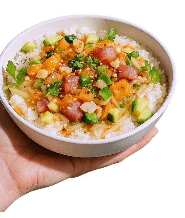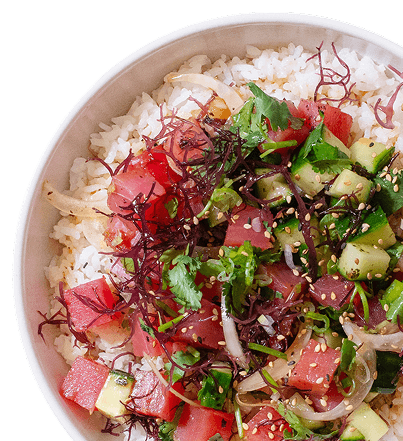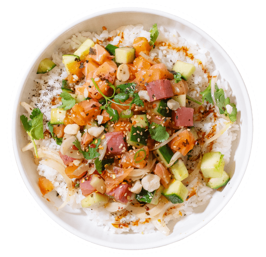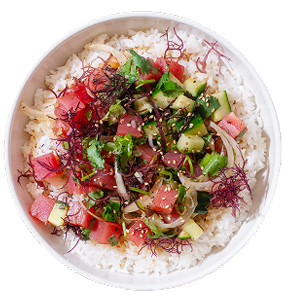 White Rice, Furikake, Tuna, Ginger Shoyu Sauce, Green Onion, Sweet Maui Onion, Cilantro, Cucumber & Chili Flakes.