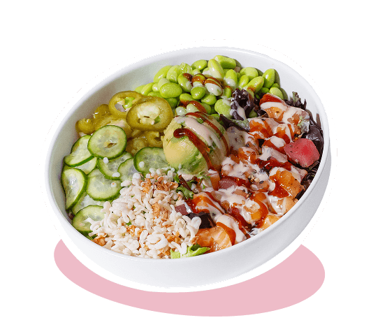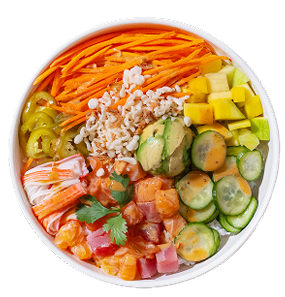 White Rice, Furikake, Salmon, Tuna, Crab Stick, Avocado, Mango, Olu Special Sauce, Pickled Cucumber, Carrot, Jalapeno, Crispy Mix, Cilantro.