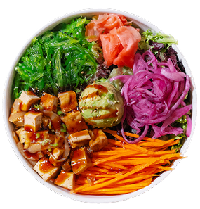 Brown Rice Barley, Furikake, Tofu, Shoyu Sauce, Avocado, Wakame, Green Onion, Pickled Onion, Pickled Ginger